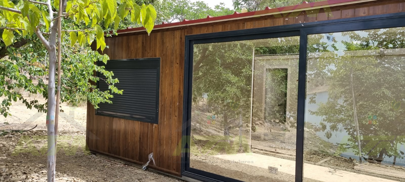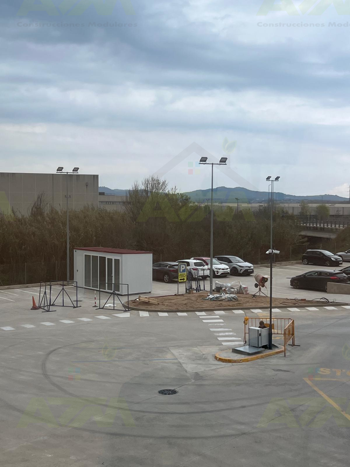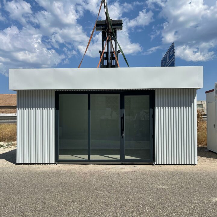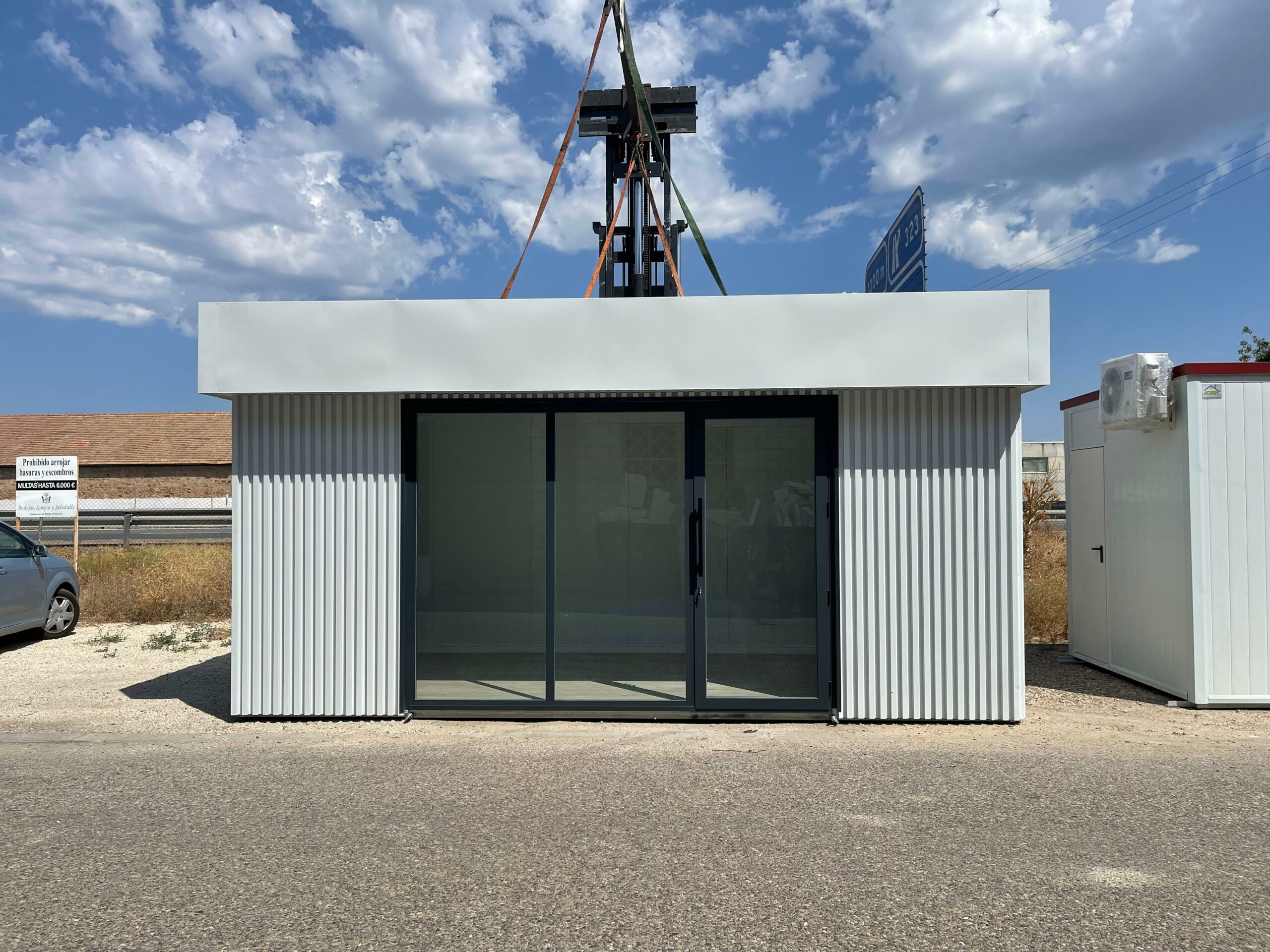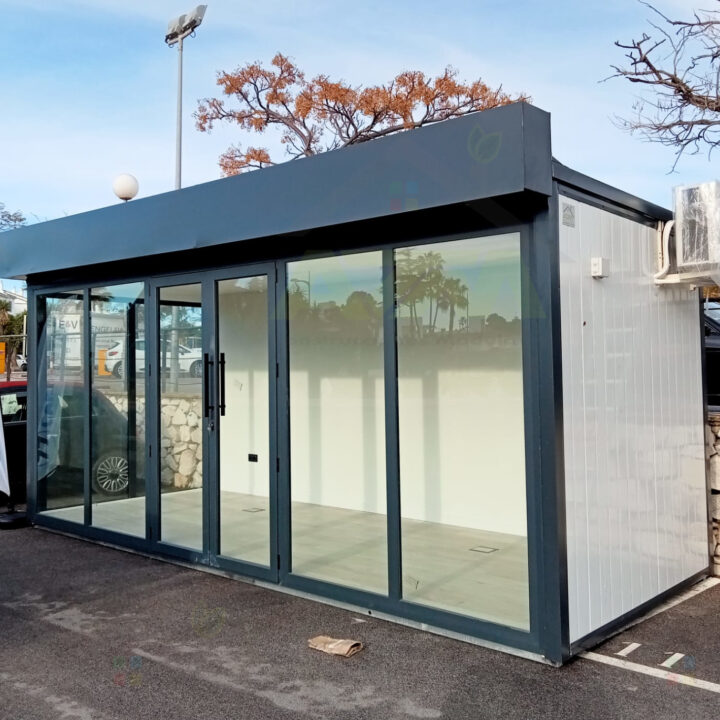 Es un módulo construido en fábrica que incorpora grandes superficies de vidrio para ganar luz natural y visibilidad. Se entrega listo para instalar como oficina, punto de venta o espacio de exposición.