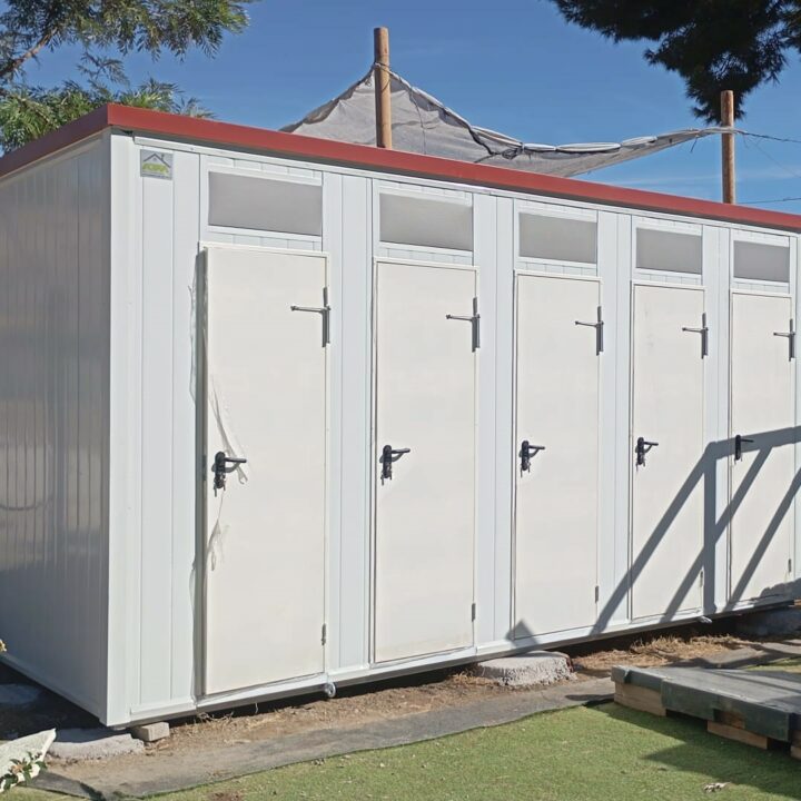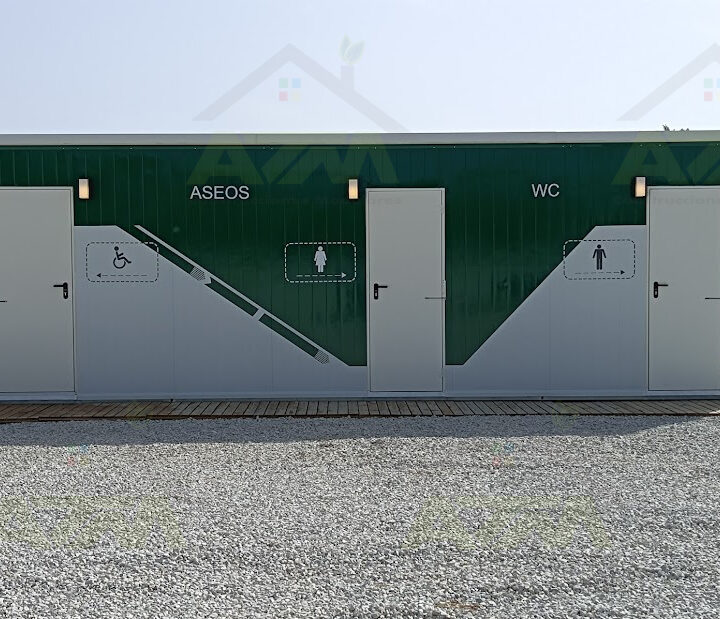Fabricamos cabinas sanitarias prefabricadas en medidas estándar de 1 × 1 m y 2 × 1 m, pensadas para una instalación sencilla y uso intensivo en sectores como industria, agricultura, ocio y eventos. Cada módulo puede configurarse a medida, ajustando distribución interior, número de cabinas, duchas, lavabos y acabados según tu proyecto.