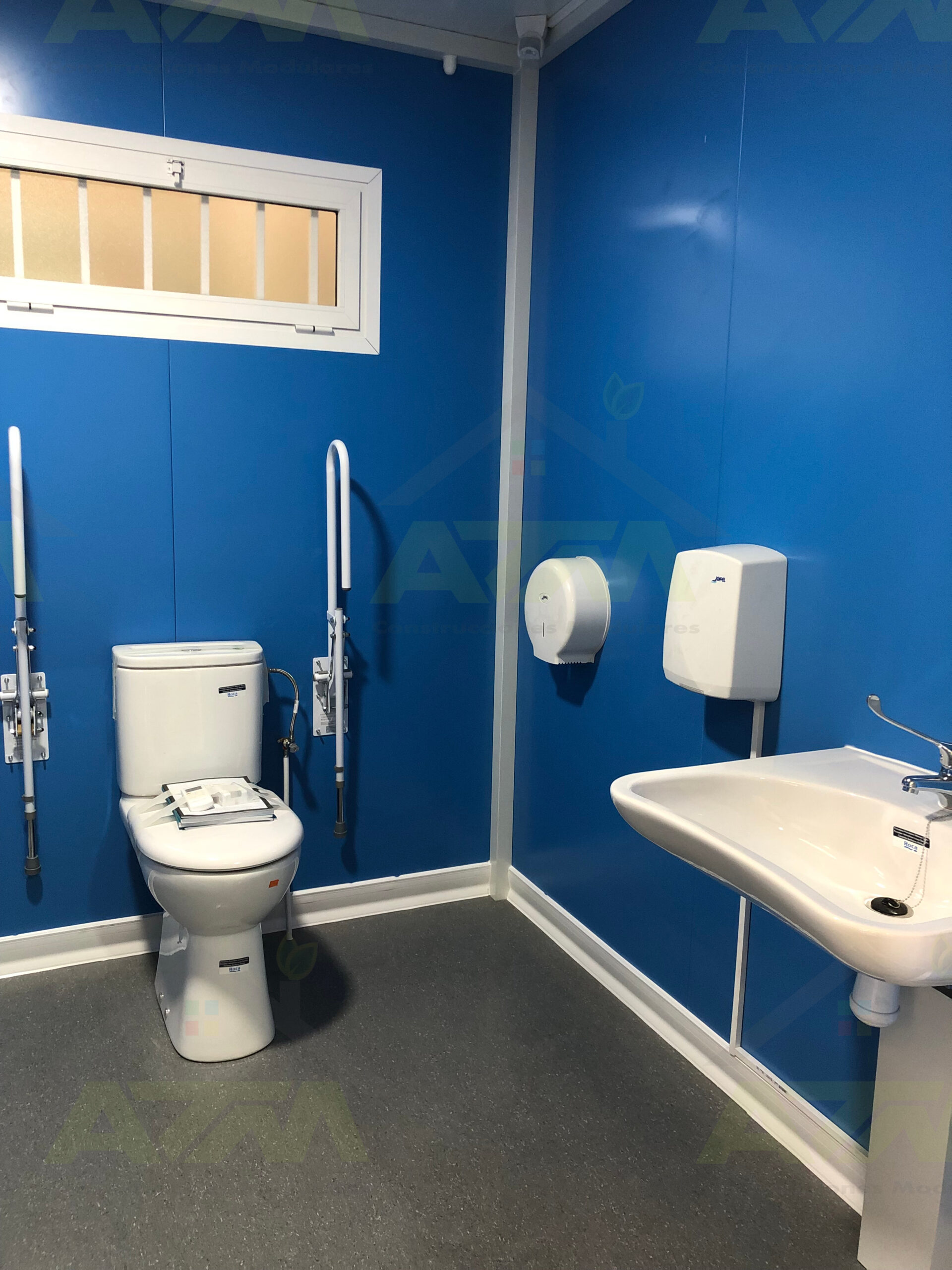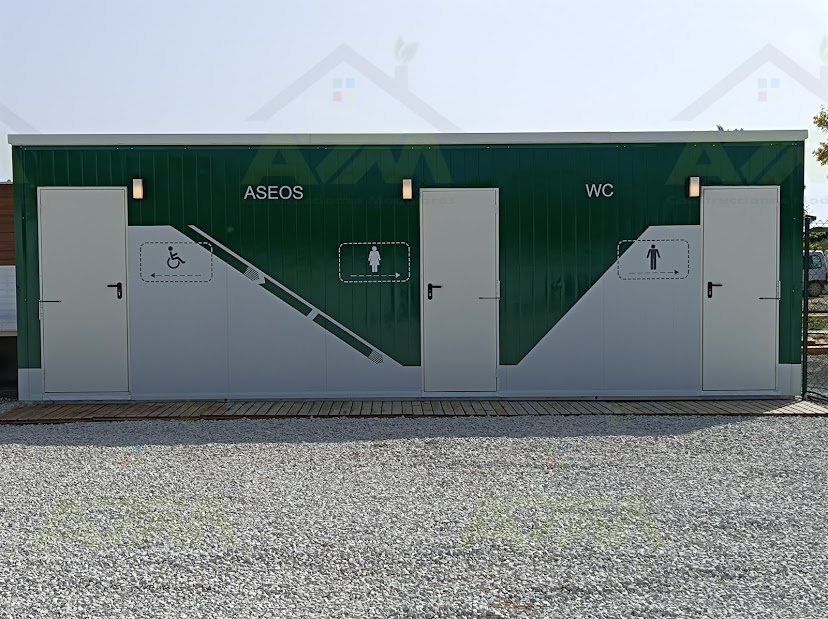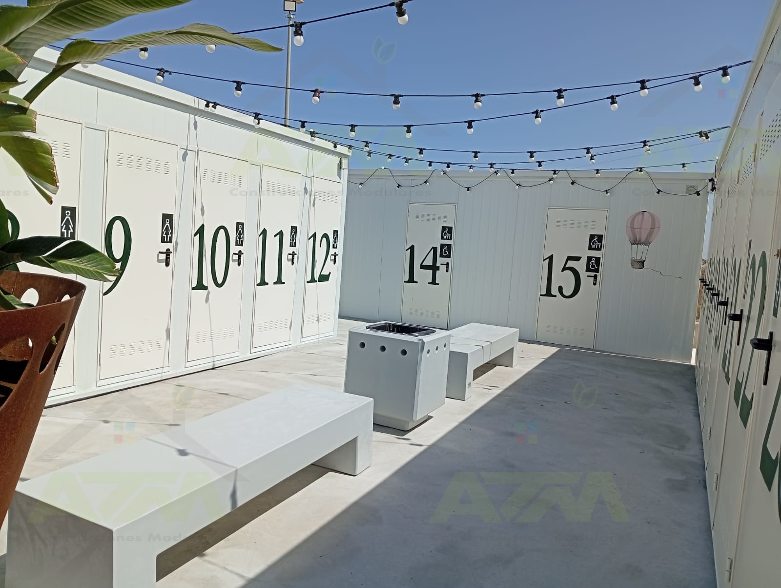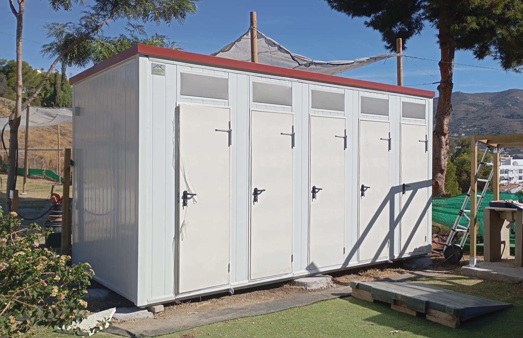 Puede incorporar WC, lavabos, duchas, duchas monedero, termo, taquillas y zona de vestuario según la configuración.